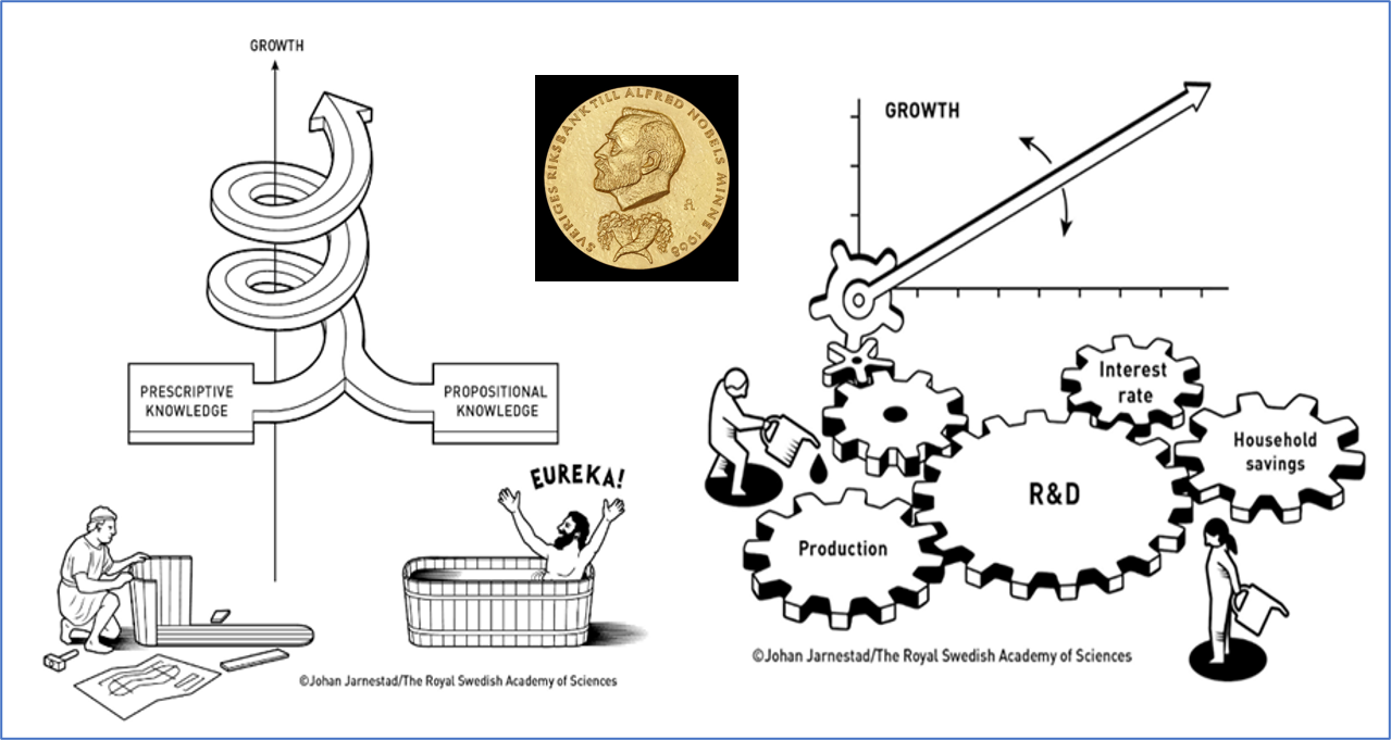 Joel Mokyr yang menerima separuh bagian dari Nobel Prize, menjelaskan mengapa berbagai inovasi dan invensi hebat sebelum era modern gagal memicu pembangunan berkelanjutan? Menurut Joel, ini karena di masa lalu invensi dan inovasi tersebut sebagian besar “terisolasi”, karena masyarakat umumnya tidak memiliki kerangka kerja untuk mengembangkannya secara sistematik. Dia mengidentifikasi ada dua jenis pengetahuan yang dibutuhkan untuk kemajuan ekonomi yang berkelanjutan: pengetahuan preskriptif (pengetahuan tentang apa yang berhasil) dan pengetahuan proposisional (pemahaman ilmiah tentang mengapa pengetahuan itu berhasil). Di era lalu, sebenarnya para inventor dan inovator juga telah menyebarkan invensi dan inovasi mereka, namun kebanyakan tidak berhasil memberikan penjelasan secara ilmiah. Untuk menghasilkan dampak pertumbuhan ekonomi, masyarakat harus bisa memfasilitasi evolusi bersama antara prinsip-prinsip ilmiah dan aplikasi praktisnya.