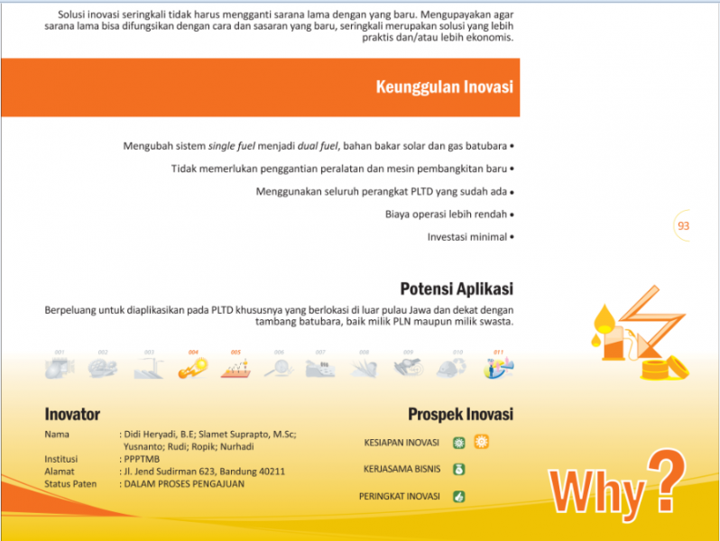 Galur Mandul Jantan Padi Tahan HDBCMS Rice Lines Resistant to BLBPengembang Galur-Galur Padi Baru Melalui Teknik Kultur Antera untuk Ketahanan Pangan Nasional Status Paten: Dalam Proses Pengajuan Kesiapan Inovasi: * Prototype Kerjasama Bisnis: *** Terbuka Peringkat Inovasi: * Prospektif | Generator Diesel BatubaraCoal Fueled Diesel GeneratorSistem Dual Fuel: Upaya Mengurangi Penggunaan Solar pada PLTD dengan Memanfaatkan Gas Batubara Status Paten: Dalam Proses Pengajuan Kesiapan Inovasi: ** Siap Dikomersialkan Kerjasama Bisnis: * Terbatas Peringkat Inovasi: * Prospektif |