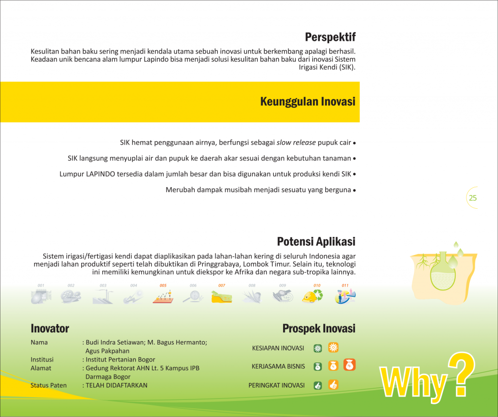 Kendi Berkah dari Lumpur BencanaBlessing Pitcher from Disastrous MudIrigasi Hemat Air Menggunakan Kendi Berbahan Baku Lumpur Lapindo Status Paten: Telah Terdaftar Kesiapan Inovasi: ** Siap Dikomersialkan Kerjasama Bisnis: *** Terbuka Peringkat Inovasi: ** Sangat Prospektif | Kitosan Sahabat ObatChitosan The Drugs CompanionGel Kitosan sebagai Membran Pelindung, Penyalut dan Agen Pengantaran Obat Status Paten: Dalam Proses Pengajuan Kesiapan Inovasi: * Prototype Kerjasama Bisnis: ** Luas Peringkat Inovasi: ** Sangat Prospektif |