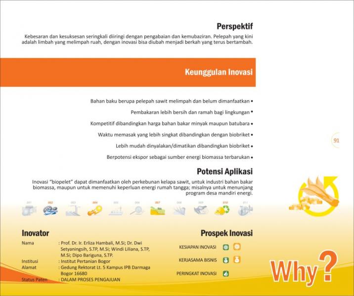 Nasi Enak, Lebih Enak, Paling Enak, Selalu EnakGood, Better, Best Rice and AlwaysSuplemen Beras: Membuat Nasi Menjadi Pulen, Bergizi, dan Wangi Status Paten: Telah Terdaftar Kesiapan Inovasi: *** Telah Dikomersialkan Kerjasama Bisnis: *** Terbuka Peringkat Inovasi: *** Paling Prospektif | Pabrik Gliserol Tak Kasat MataInvisible Glycerol FactoryPengolahan Limbah Industri Biodiesel menjadi Produk Bernilai: Langkah Awal menjadi Biorefinery Status Paten: Dalam Proses Pengajuan Kesiapan Inovasi: * Prototype Kerjasama Bisnis: ** Luas Peringkat Inovasi: ** Sangat Prospektif |