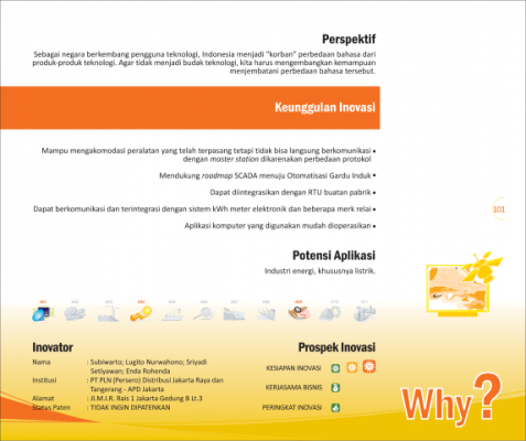 Penerjemah di Gardu ListrikTranslator in Electricity SubstationRTU Konsentrator Multi Protokol Status Paten: Kesiapan Inovasi: *** Telah Dikomersialkan Kerjasama Bisnis: * Terbatas Peringkat Inovasi: * Prospektif | Pengering Biji-Bijian Sistem KombinasiCombination Drying System for GrainRancang Bangun Alar Pengering Efek Rumah Kaca (ERK)-Hybrid dan In-store Dryer (ISD) Terintegrasi untuk Biji-Bijian Status Paten: Dalam Proses Pengajuan Kesiapan Inovasi: * Prototype Kerjasama Bisnis: *** Terbuka Peringkat Inovasi: * Prospektif |