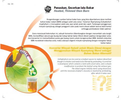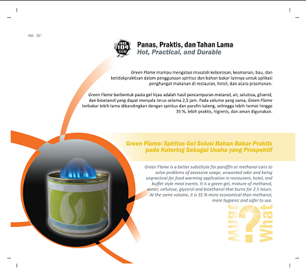 Panas, Praktis, dan Tahan LamaHot, Practical, and DurableGreen Flame : Spiritus Gel Solusi Bahan Bakar Praktis pada Katering Sebagai Usaha yang Prospektif Status Paten: Dalam Proses Pengajuan Kesiapan Inovasi: *** Telah Dikomersialkan Kerjasama Bisnis: ** Luas Peringkat Inovasi: ** Sangat Prospektif | Panaskan, Encerkan lalu BakarHeated, Thinned them BurnKonverter Minyak Nabati untuk Mesin Diesel dengan Menggunakan Minyak Nyamplung Murni sebagai Bahan Bakar Alternatif Status Paten: Telah Terdaftar Kesiapan Inovasi: * Prototype Kerjasama Bisnis: ** Luas Peringkat Inovasi: * Prospektif |