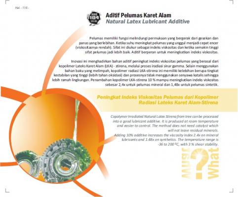 Aditif Pelumas Karet AlamNatural Latex Lubricant AdditivePeningkat Indeks Viskositas Pelumas dari Kopolimer Radiasi Lateks Karet Alam-Stirena Status Paten: Telah Terdaftar Kesiapan Inovasi: * Prototype Kerjasama Bisnis: *** Terbuka Peringkat Inovasi: * Prospektif | Aduk, Ayak, Angkut... SekaligusScrub, Screen, Shift . . . AltogetherPengayak Berputar dengan Pengaduk dan Pengangkut dalam Bak Air (Rotary Drum Scrubber - RDS) Status Paten: Dalam Proses Pengajuan Kesiapan Inovasi: * Prototype Kerjasama Bisnis: * Terbatas Peringkat Inovasi: * Prospektif |