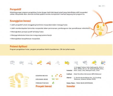 Mengawetkan si PengawetPreserving PreservativesBiji Picung Beku untuk Mengawetkan Ikan Status Paten: Kesiapan Inovasi: * Prototype Kerjasama Bisnis: * Terbatas Peringkat Inovasi: ** Sangat Prospektif | Mengindustrikan Gula Semut TradisionalIndustrializing Traditional Palm SugarMesin Pengolah Gulasemut Berbasis Nira Kelapa Status Paten: Telah Terdaftar Kesiapan Inovasi: * Prototype Kerjasama Bisnis: * Terbatas Peringkat Inovasi: * Prospektif |