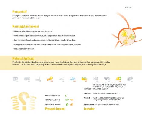 Mengolah Angka Menjadi juaraProcess The Number be The ChampionOlimpiade Mengolah Angka Pertama di Dunia Status Paten: Telah Terdaftar Kesiapan Inovasi: *** Telah Dikomersialkan Kerjasama Bisnis: ** Luas Peringkat Inovasi: * Prospektif | Mengolah Sampah Tanpa si BauTransforming Waste without the OdorTeknologi Anaerobic Composting untuk Mengolah Sampah Organik Menjadi Biogas, Kompos, dan Pupuk Cair Status Paten: Dalam Proses Pengajuan Kesiapan Inovasi: * Prototype Kerjasama Bisnis: ** Luas Peringkat Inovasi: ** Sangat Prospektif |