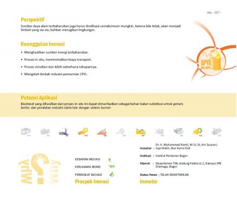 Alirkan, Perkecil dan KonsentrasikanStream It, Scale Down and IntensifyReaktor Kompak Trans-esterifikasi untuk Produksi Biodiesel Berbasis Gelombang Mikro Status Paten: Telah Terdaftar Kesiapan Inovasi: * Prototype Kerjasama Bisnis: *** Terbuka Peringkat Inovasi: * Prospektif | Ambulans IkanFish AmbulanceSistem Pengepakan Ikan dengan Zeogracc Status Paten: Dalam Proses Pengajuan Kesiapan Inovasi: * Prototype Kerjasama Bisnis: ** Luas Peringkat Inovasi: * Prospektif |