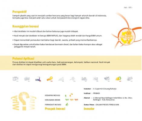 Pertumbuhan Sehat dari LautanHealthy Growth fron the OceanOligoalginat Iradiasi sebagai Zat Pengatur Tumbuh Organik Status Paten: Telah Terdaftar Kesiapan Inovasi: * Prototype Kerjasama Bisnis: *** Terbuka Peringkat Inovasi: *** Paling Prospektif | Plastik, Dari dan Kembali Menjadi MinyakPlastic, From and Back into OilDaur Ulang Limbah/Sampah Plastik Jadi Bahan Bakar Minyak (BBM) Status Paten: Dalam Proses Pengajuan Kesiapan Inovasi: ** Siap Dikomersialkan Kerjasama Bisnis: *** Terbuka Peringkat Inovasi: * Prospektif |