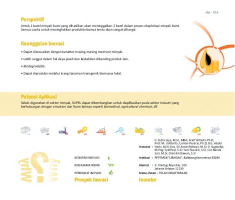 SUPE(r)L Surfaktan Minyak BumiCrude Oil SUPE(r)L SurfactantSekuen Molekul Asam Amino Peptida Bersifat Surfaktan Anionik : Inovasi Bioteknologi Protein untuk Peningkatan Perolehan Reservoar Minyak Status Paten: Telah Terdaftar Kesiapan Inovasi: * Prototype Kerjasama Bisnis: * Terbatas Peringkat Inovasi: * Prospektif | Susu Super Kecambah KedelaiSuperior Soy Germ MilkMinuman Fungsional Berbasis Protein Kecambah Kedelai untuk Memperbaiki Profil Lipid Penderita Diabetes Mellitua Tipe-2 yang Beresiko Tinggi Penyakit Jantung Koroner Status Paten: Telah Terdaftar Kesiapan Inovasi: * Prototype Kerjasama Bisnis: ** Luas Peringkat Inovasi: * Prospektif |
