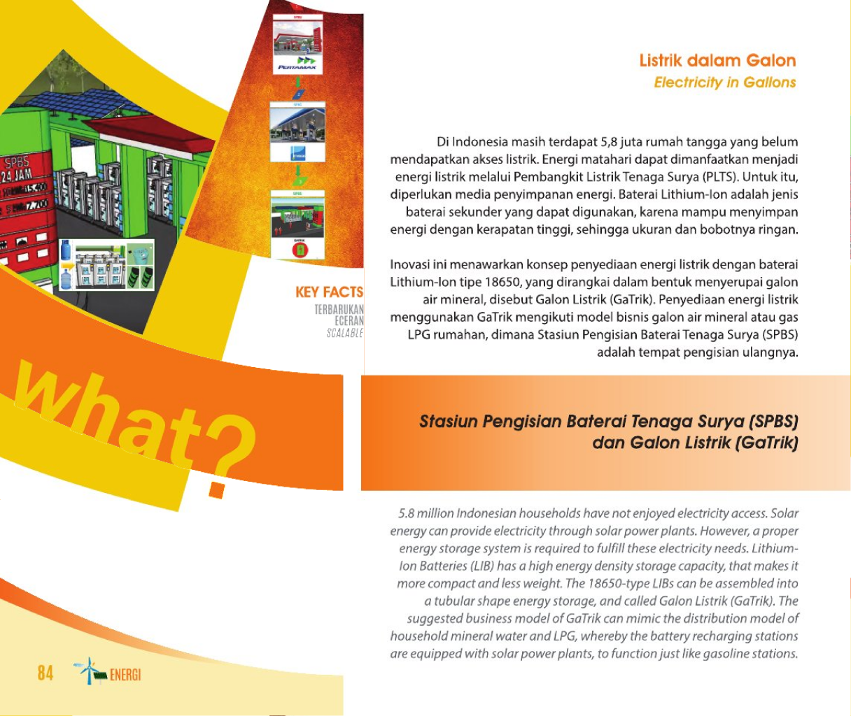 Beras LautOceanic RiceStatus Paten: Dalam Proses Pengajuan Kesiapan Inovasi: Kerjasama Bisnis: * Terbatas Peringkat Inovasi: ** Sangat Prospektif | Berkah dari JelantahBlessing from Waste Cooking OilPengembangan Materi Nanopartikel dari Limbah Minyak Goreng Jelantah dan Karat Besi untuk Pengurangan Kandungan Sulfur Bahan Bakar Kendaraan Bermotor Status Paten: Dalam Proses Pengajuan Kesiapan Inovasi: Kerjasama Bisnis: ** Luas Peringkat Inovasi: * Prospektif |