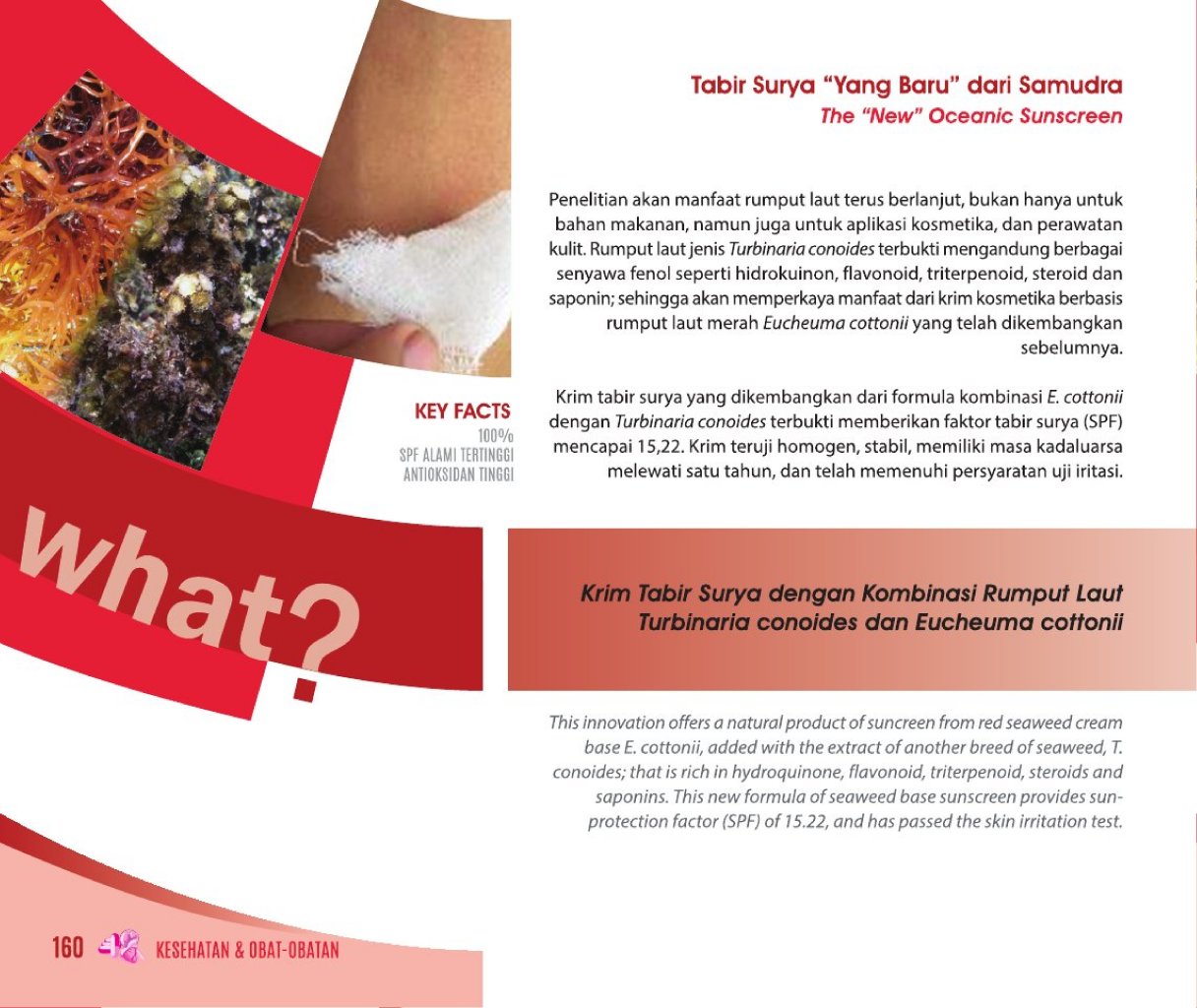 Tabir SuryaTheKrim Tabir Surya dengan Kombinasi Rumput Laut Turbinaria conoides dan Eucheuma cottonii Status Paten: Dalam Proses Pengajuan Kesiapan Inovasi: Kerjasama Bisnis: * Terbatas Peringkat Inovasi: * Prospektif | Tanah & Buah Menyandera WarnaSoil & Fruit Detain the DyeTanah Liat Penyerap Zat Warna Status Paten: Dalam Proses Pengajuan Kesiapan Inovasi: Kerjasama Bisnis: ** Luas Peringkat Inovasi: * Prospektif |
