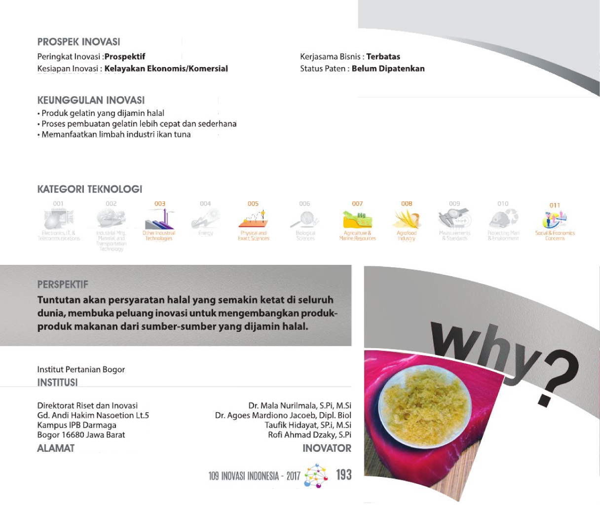 Dijamin HalalHalal AssuredPengembangan Gelatin Kulit Ikan Tuna sebagai Upaya Mengurangi Ketergantungan Produk Impor Status Paten: Dalam Proses Pengajuan Kesiapan Inovasi: Kerjasama Bisnis: * Terbatas Peringkat Inovasi: * Prospektif | Dua Manfaat dalam Satu KejuTwo Benefits in One CheeseProduksi Non-Dairy Cheese Berbahan Baku Kedelai Menggunakan Bakteri Asam Laktat pada Dadih Status Paten: Dalam Proses Pengajuan Kesiapan Inovasi: Kerjasama Bisnis: ** Luas Peringkat Inovasi: ** Sangat Prospektif |