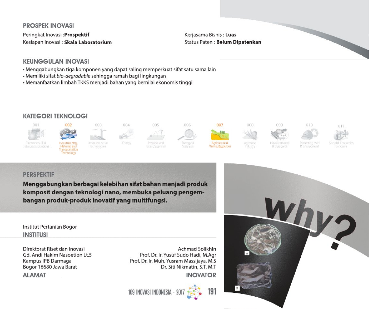 Kompor Berenergi Biomassa nan ModernThe Modern Biomass Energy StovesMemasak dengan Kompor Pellet Biomassa Vortex Sebersih Menggunakan Kompor LPG Status Paten: Telah Terdaftar Kesiapan Inovasi: Kerjasama Bisnis: *** Terbuka Peringkat Inovasi: * Prospektif | Kuat tapi RamahStrong but FriendlyFilm Nanokomposit Ramah Lingkungan dari Matrik Biopolimer dan Penguat Nanoserat Tandan Kosong Kelapa Sawit Status Paten: Dalam Proses Pengajuan Kesiapan Inovasi: Kerjasama Bisnis: ** Luas Peringkat Inovasi: * Prospektif |
