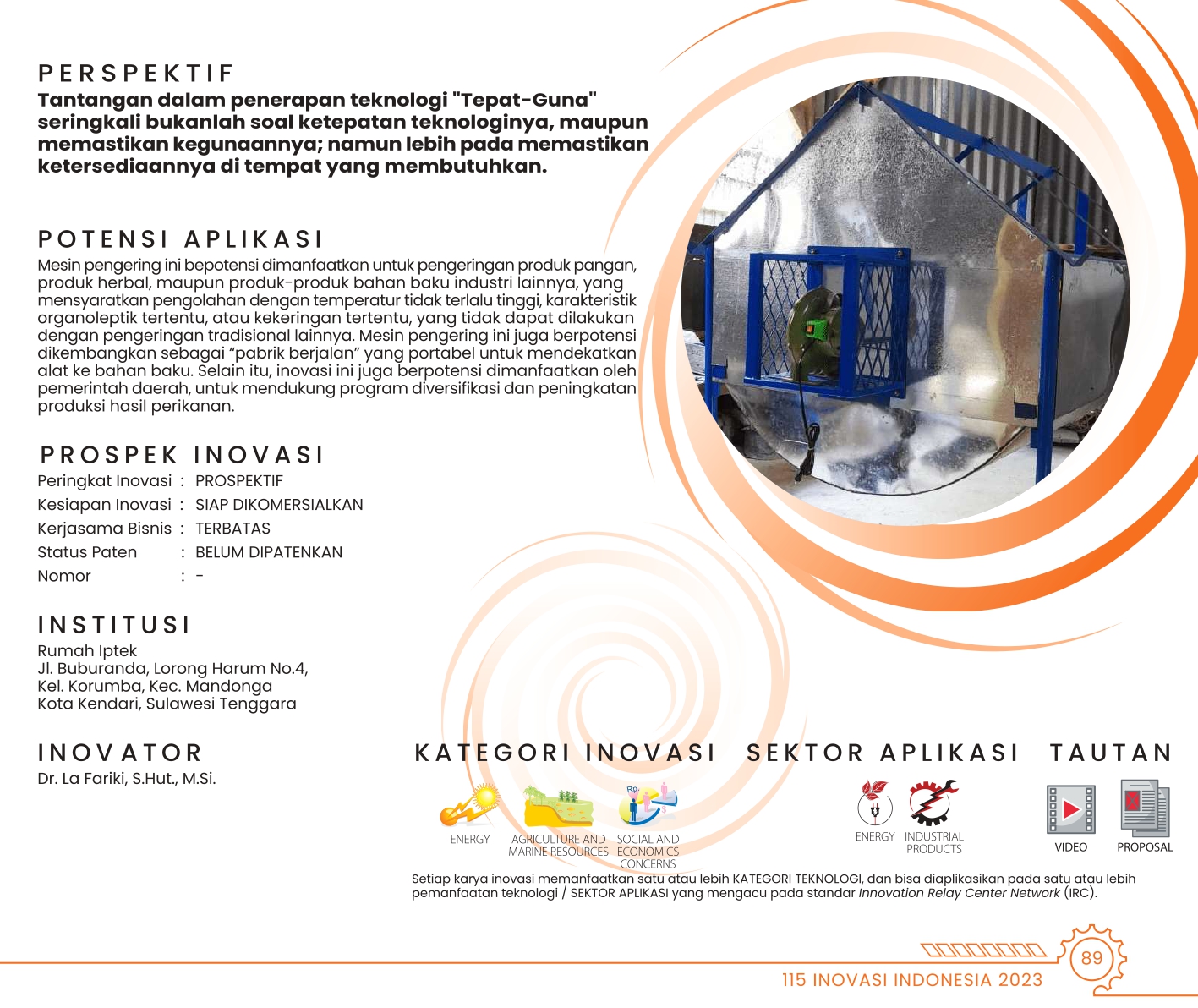 Penjemur Ikan BerteknologiTech Fish DryingINOVASI MESIN KOLEKTOR PANAS MATAHARI MODEL BELAHAN SILINDER Status Paten: Belum Didaftarkan Kesiapan Inovasi: ** Siap Dikomersialkan Kerjasama Bisnis: * Terbatas Peringkat Inovasi: * Prospektif | Peringatan Dini Awas Kereta ApiEarly Warning for Trains CrossingPETA AMAN PERLINTASAN KERETA API "DOUBLE AWARENESS DRIVING - DAD" Status Paten: Dalam Proses Pengajuan Kesiapan Inovasi: * Prototype Kerjasama Bisnis: ** Luas Peringkat Inovasi: * Prospektif |