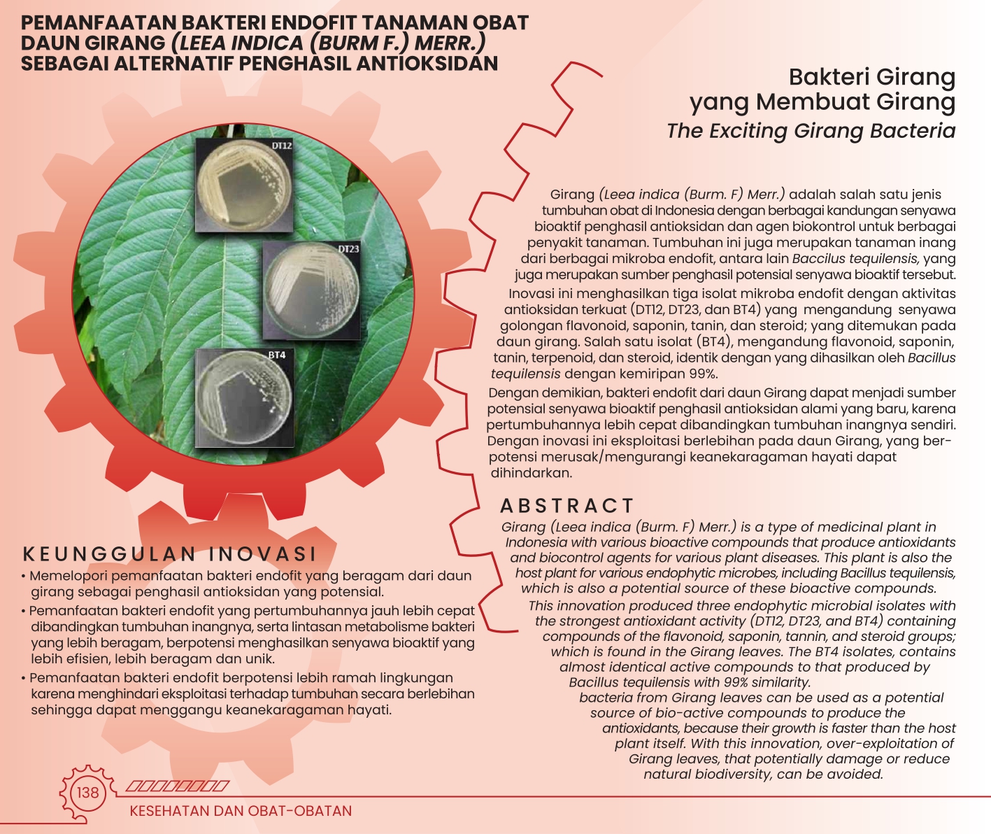 Agar Implan Disukai BadanMaking the Body Welcomes ImplantsNANOHIDROKSIAPATIT SEBAGAI PELAPIS IMPLAN LOGAM: UPAYA MENINGKATKAN BIOKOMPATIBILITAS IMPLAN LOGAM Status Paten: Dalam Proses Pengajuan Kesiapan Inovasi: * Prototype Kerjasama Bisnis: ** Luas Peringkat Inovasi: * Prospektif | Bakteri Girang yang Membuat GirangThe Exciting Girang BacteriaPEMANFAATAN BAKTERI ENDOFIT TANAMAN OBAT DAUN GIRANG (LEEA INDICA (BURM F.) MERR.) SEBAGAI ALTERNATIF PENGHASIL ANTIOKSIDAN Status Paten: Dalam Proses Pengajuan Kesiapan Inovasi: * Prototype Kerjasama Bisnis: *** Terbuka Peringkat Inovasi: * Prospektif |