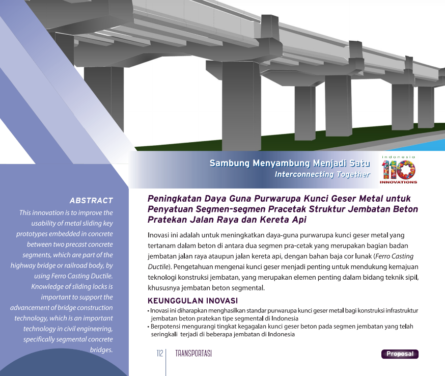 Inovasi ini adalah untuk meningkatkan daya-guna purwarupa kunci geser metal yang tertanam dalam beton di antara dua segmen pra-cetak yang merupakan bagian badan jembatan jalan raya ataupun jalan kereta api, dengan bahan baja cor lunak/Ferro Casting Ductile. Pengetahuan mengenai kunci geser menjadi penting untuk mendukung kemajuan teknologi konstruksi jembatan, yang merupakan elemen penting dalam bidang teknik sipil, khususnya jembatan beton segmental.