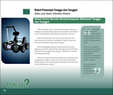 Robot Pemanjat Tangga dan TanggulDike and Stair Climber RobotMobil Robot Beroda Berkemampuan Melewati Tangga dan Tanggul Status Paten: Telah Terdaftar Kesiapan Inovasi: * Prototype Kerjasama Bisnis: *** Terbuka Peringkat Inovasi: *** Terbuka | |