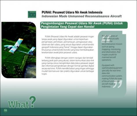 PUNAI: Pesawat Udara Nir Awak IndonesiaPUNAI : Indonesian Made Unmanned Reconnaissance AircraftPengembangan Pesawat Udara Nir Awak (PUNA) Untuk Pengintaian Yang Cepat dan Handal Status Paten: Dalam Proses Pengajuan Kesiapan Inovasi: * Prototype Kerjasama Bisnis: * Terbatas Peringkat Inovasi: * Terbatas | |
