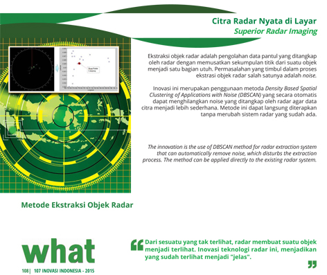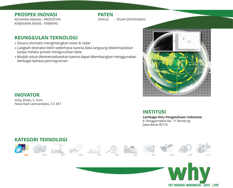 Citra Radar Nyata di LayarSuperior Radar ImagingMetode Ekstraksi Objek Radar Status Paten: Telah Terdaftar Kesiapan Inovasi: Kerjasama Bisnis: *** Terbuka Peringkat Inovasi: *** Terbuka | |
