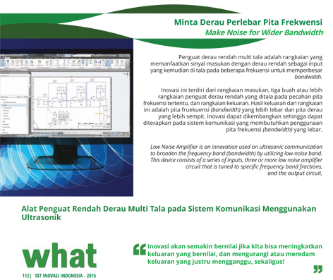 Minta Derau Perlebar Pita FrekwensiMake Noise for Wider BandwidthAlat Penguat Rendah Derau Multi Tala pada Sistem Komunikasi Menggunakan Ultrasonik Status Paten: Telah Terdaftar Kesiapan Inovasi: Kerjasama Bisnis: ** Luas Peringkat Inovasi: ** Luas | |