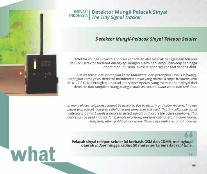 Detektor Mungil Pelacak SinyalThe Tiny Signal TrackerDetektor Mungil-Pelacak Sinyal Telepon Seluler Status Paten: Telah Terdaftar Kesiapan Inovasi: Kerjasama Bisnis: ** Luas Peringkat Inovasi: ** Luas | |