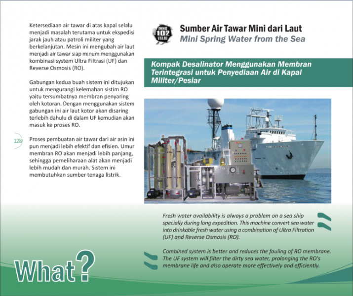 Sumber Air Tawar Mini dari LautMini Spring Water from the SeaKompak Desalinator Men ggunakan Membran Terintegrasi untuk Pen yediaan Air di Kapal Militer/Pesiar Status Paten: Dalam Proses Pengajuan Kesiapan Inovasi: * Prototype Kerjasama Bisnis: * Terbatas Peringkat Inovasi: * Terbatas | |