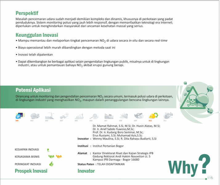 SPPD: Sistem Peringatan Polusi DiniPEWS: Pollution Early Warning SystemSistem Pendeteksi Nirkabel Gas Nitrogen Dioksida (NO2) Berbasis Sensor Kristal Fotonik dan Efek Beer Lambert Status Paten: Telah Terdaftar Kesiapan Inovasi: * Prototype Kerjasama Bisnis: ** Luas Peringkat Inovasi: ** Luas | |