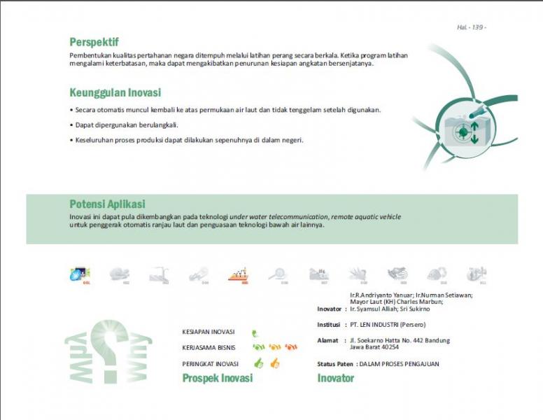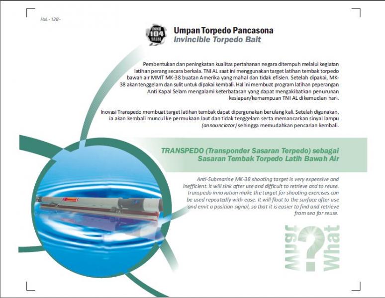 Umpan Torpedo PancasonaInvicible Torpedo BaitTRANSPEDO (Transponder Sasaran Torpedo) sebagai Sasaran Tembak Torpedo Latih Bawah Air Status Paten: Dalam Proses Pengajuan Kesiapan Inovasi: * Prototype Kerjasama Bisnis: *** Terbuka Peringkat Inovasi: *** Terbuka | |