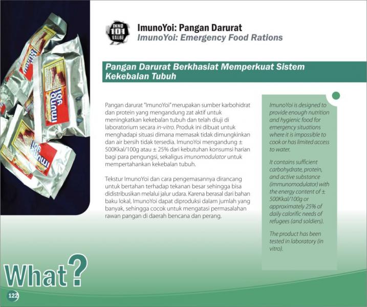 ImunoYoi: Pangan DaruratImunoYoi: Emergency Food RationsPangan Darurat Berkhasiat Memperkuat Sistem Kekebalan Tubuh Status Paten: Dalam Proses Pengajuan Kesiapan Inovasi: * Prototype Kerjasama Bisnis: ** Luas Peringkat Inovasi: ** Luas | |