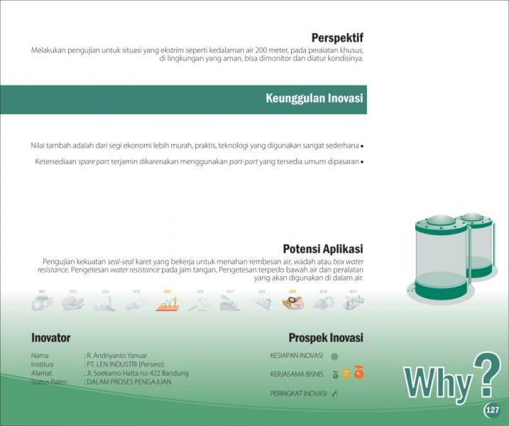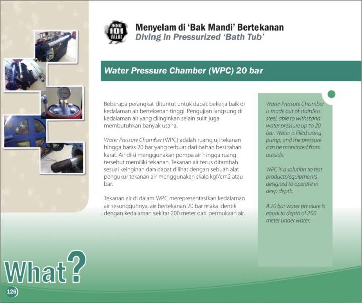 Menyelam di Bak Mandi BertekananDiving in Pressurized 'Bath Tub'Water Pressure Chamber (WPC) 20 bar Status Paten: Dalam Proses Pengajuan Kesiapan Inovasi: * Prototype Kerjasama Bisnis: *** Terbuka Peringkat Inovasi: *** Terbuka | |