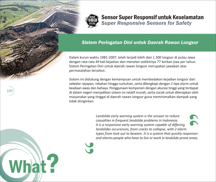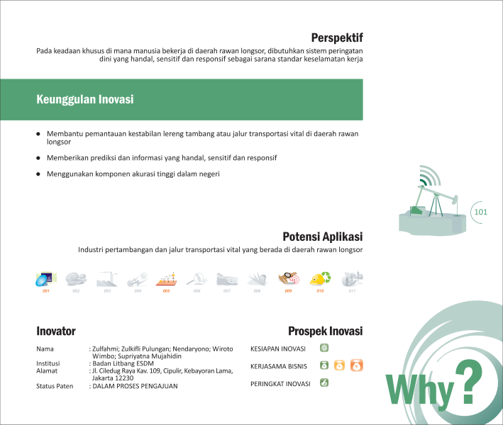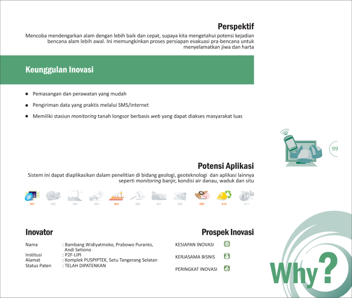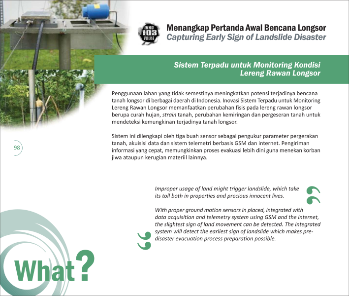 Menangkap Pertanda Awal Bencana LongsorCapturing Early Sign of Landslide DisasterSistem Terpadu untuk Monitoring Kondisi Lereng Rawan Longsor Status Paten: Telah Terdaftar Kesiapan Inovasi: * Prototype Kerjasama Bisnis: * Terbatas Peringkat Inovasi: * Terbatas | |