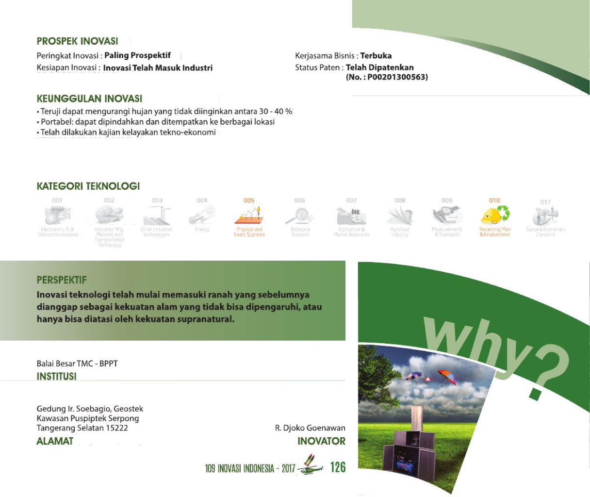 Pawang Hujan IlmiahScientific Rain MasterTeknologi GPG (Ground Particles Generator) untuk Mengurangi Bencana Banjir, Longsor dan Badai Tropis Status Paten: Telah Terdaftar Kesiapan Inovasi: Kerjasama Bisnis: *** Terbuka Peringkat Inovasi: *** Terbuka | |