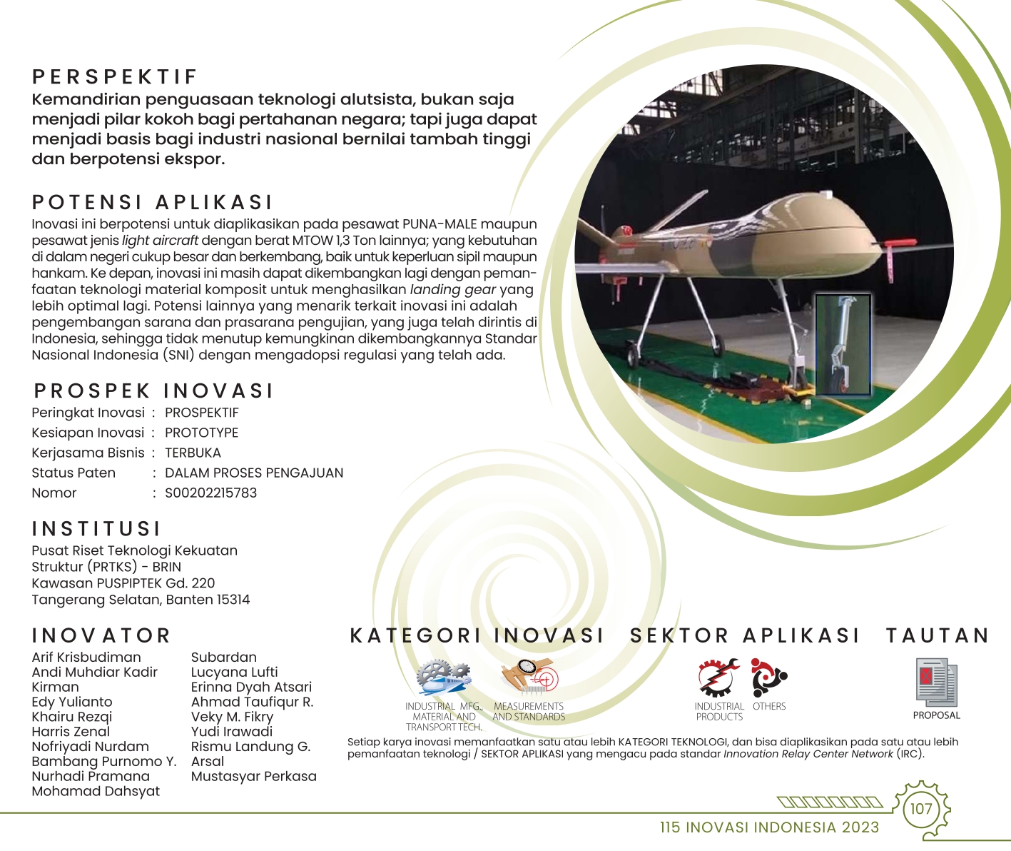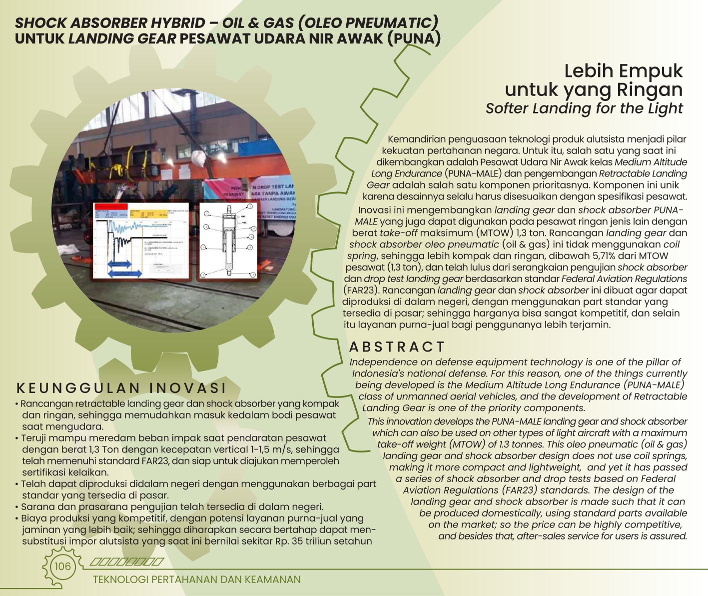 Lebih Empuk untuk yang RinganSofter Landing for the LightSHOCK ABSORBER HYBRID – OIL & GAS (OLEO PNEUMATIC) UNTUK LANDING GEAR PESAWAT UDARA NIR AWAK (PUNA) Status Paten: Dalam Proses Pengajuan Kesiapan Inovasi: * Prototype Kerjasama Bisnis: *** Terbuka Peringkat Inovasi: *** Terbuka | |