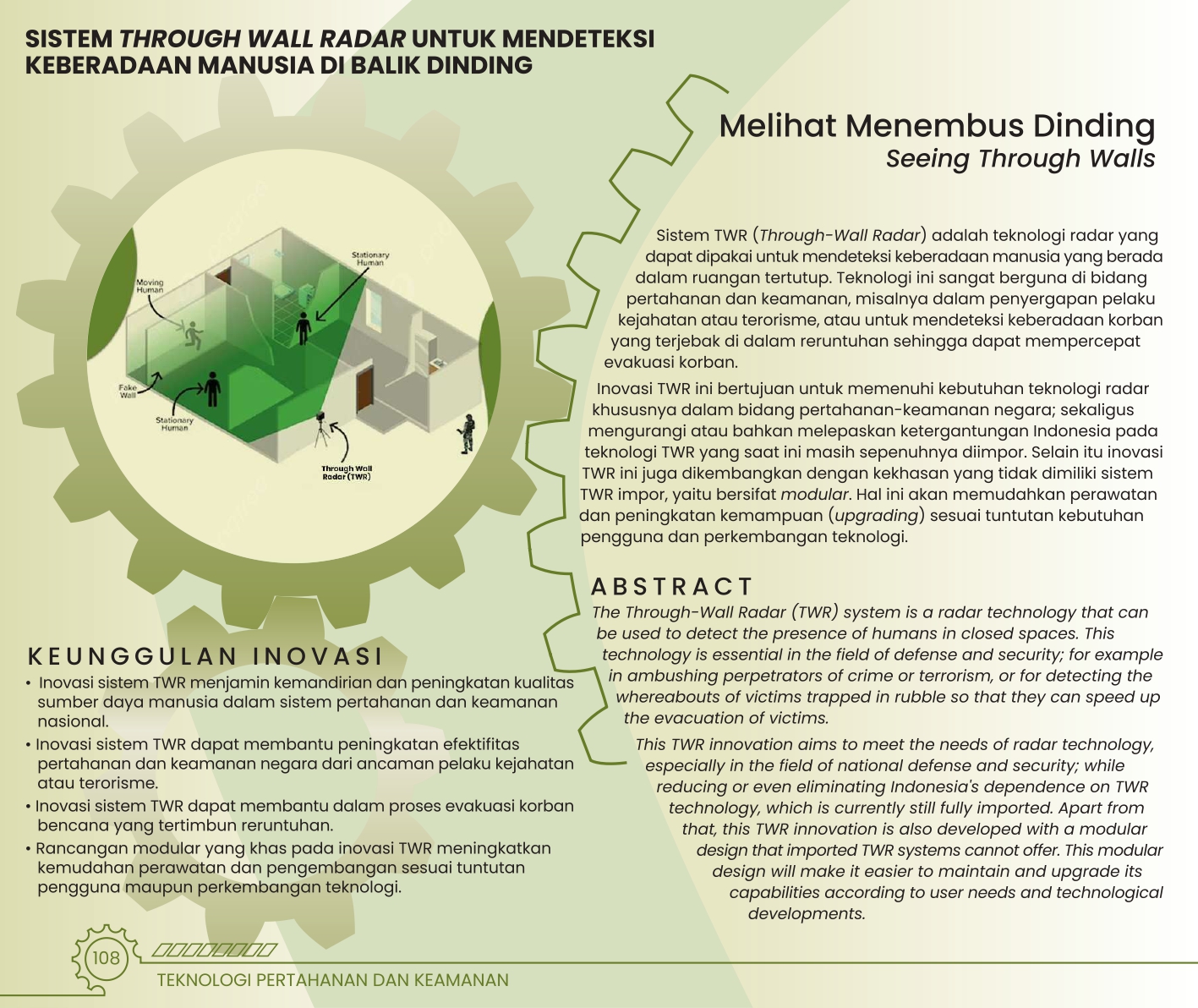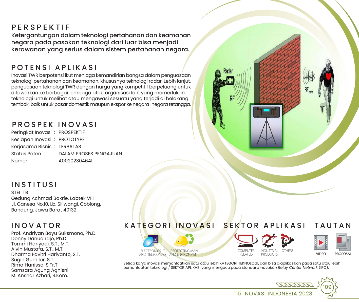 Melihat Menembus DindingSeeing Through WallsSISTEM THROUGH WALL RADAR UNTUK MENDETEKSI KEBERADAAN MANUSIA DI BALIK DINDING Status Paten: Dalam Proses Pengajuan Kesiapan Inovasi: * Prototype Kerjasama Bisnis: * Terbatas Peringkat Inovasi: * Terbatas | |