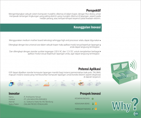 Komputer Super Dalam KoperSuper Computer in a CaseGround Station Portable (GSP) Sebagai Standar Personal Komputer Lapangan Status Paten: Dalam Proses Pengajuan Kesiapan Inovasi: * Prototype Kerjasama Bisnis: ** Luas Peringkat Inovasi: ** Luas | |