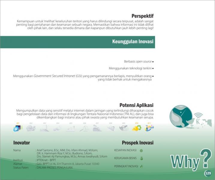 Melihat Jauh ke HorizonLooking at Distant HorizonIntegrated Maritime Surveillance System (IMSS) Status Paten: Dalam Proses Pengajuan Kesiapan Inovasi: * Prototype Kerjasama Bisnis: * Terbatas Peringkat Inovasi: * Terbatas | |