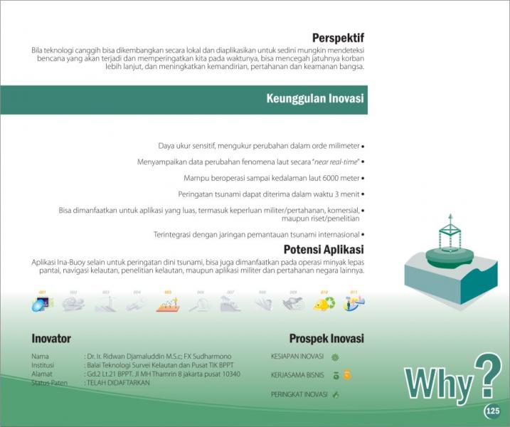 Sistem Peringatan Dini TsunamiTsunami Early Warning System (TEWS)Sistem Ina-Buoy Status Paten: Telah Terdaftar Kesiapan Inovasi: * Prototype Kerjasama Bisnis: ** Luas Peringkat Inovasi: ** Luas | |