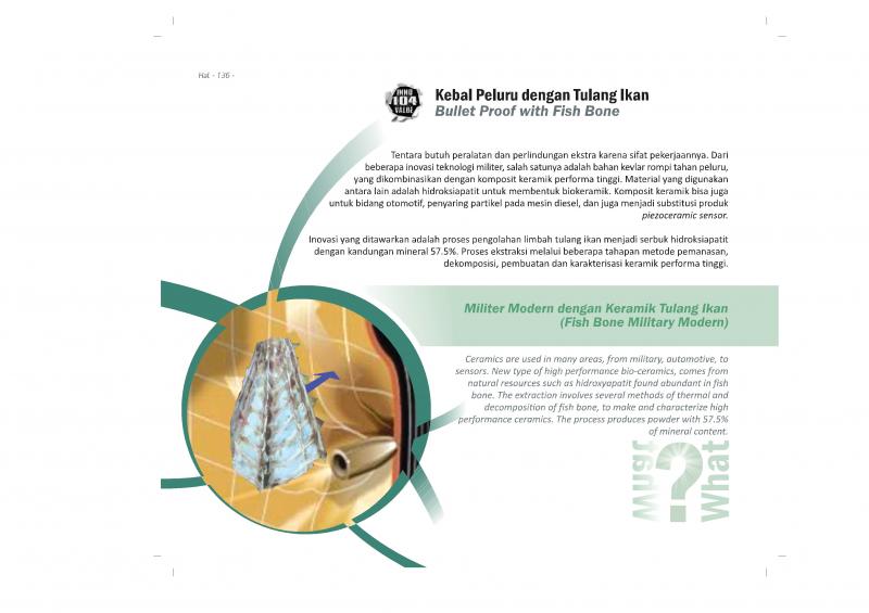 Kebal Peluru dengan Tulang IkanBullet Proof with Fish BoneMiliter Modern dengan Keramik Tulang Ikan (Fish Bone Military Modern) Status Paten: Dalam Proses Pengajuan Kesiapan Inovasi: * Prototype Kerjasama Bisnis: * Terbatas Peringkat Inovasi: * Terbatas | |