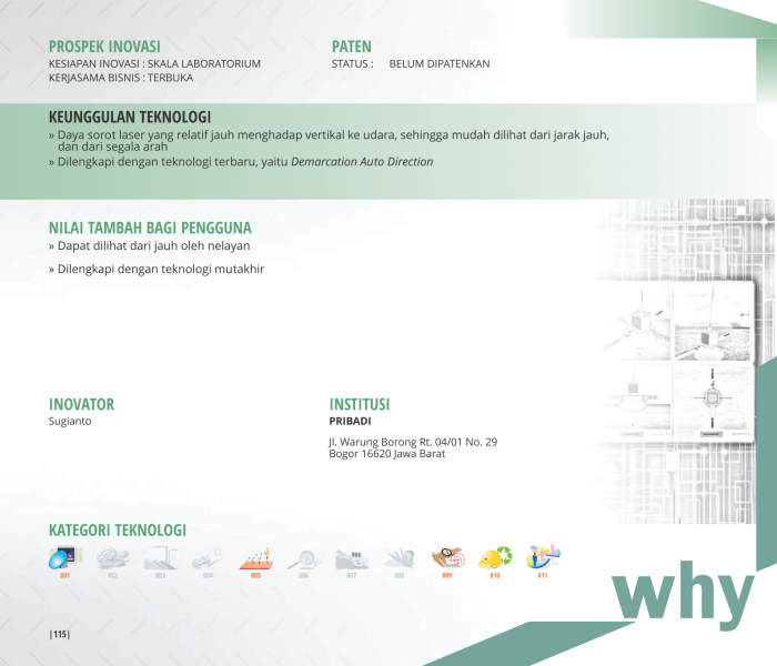 Batas Laut Bebas KemelutDispute Free Marine BoundaryPenanda Batas Laut Sistem Laser Plus Pengarah Demarkasi Otomat Status Paten: Dalam Proses Pengajuan Kesiapan Inovasi: * Prototype Kerjasama Bisnis: *** Terbuka Peringkat Inovasi: *** Terbuka | |