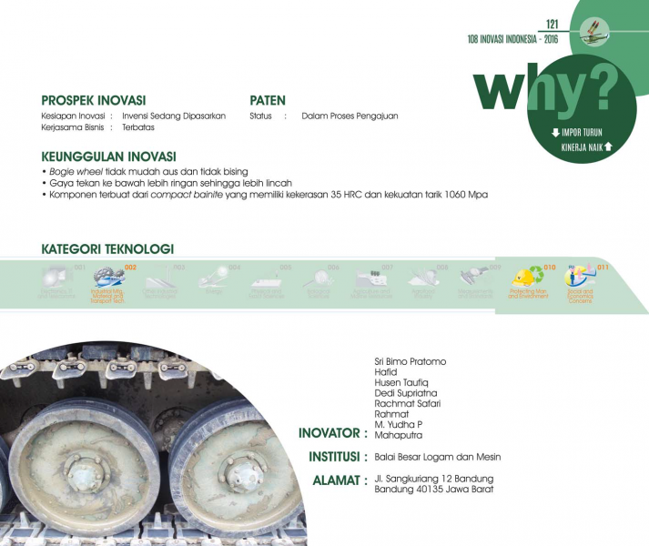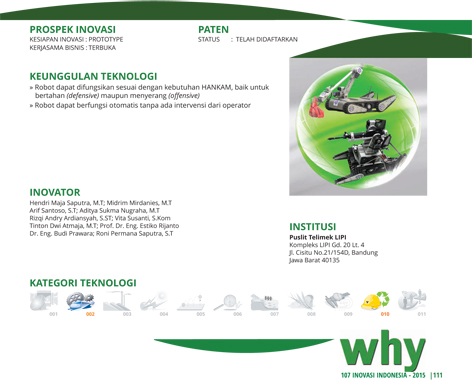 Mengganti Sepatu sang ScorpionReplacing the Scorpion ShoesModifikasi Tapak Rantai Kendaraan Tempur Tank Jenis Scorpion Double Pin sebagai Litbang Bekelanjutan untuk Kemandirian Hankam Nasional Status Paten: Dalam Proses Pengajuan Kesiapan Inovasi: Kerjasama Bisnis: * Terbatas Peringkat Inovasi: * Terbatas | |