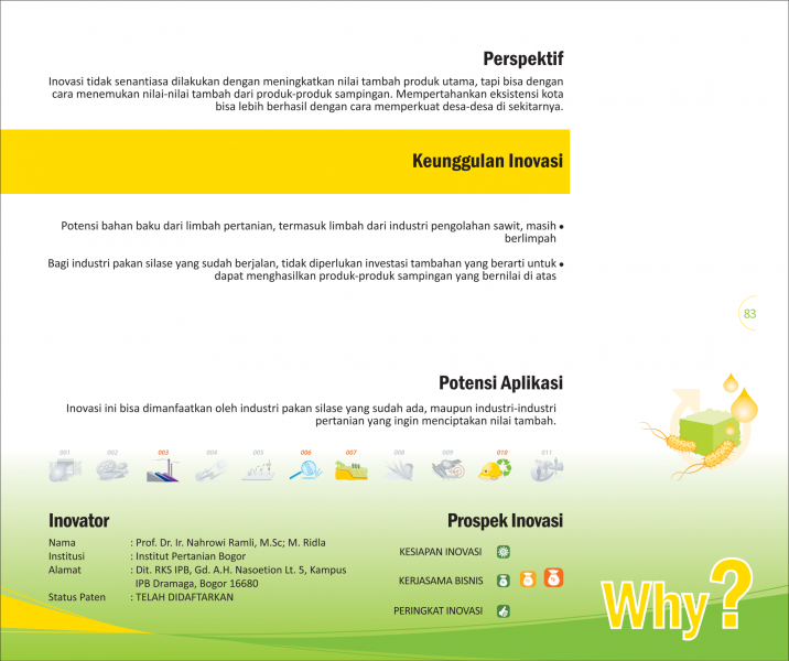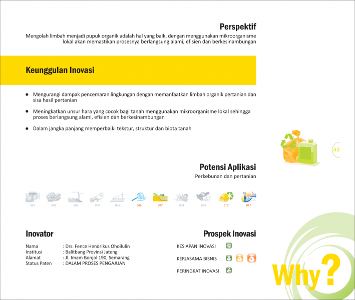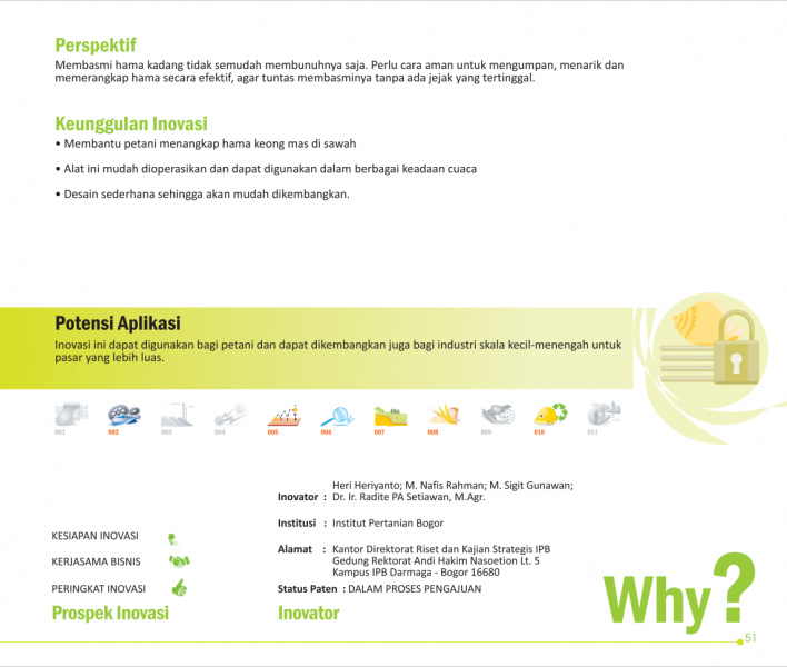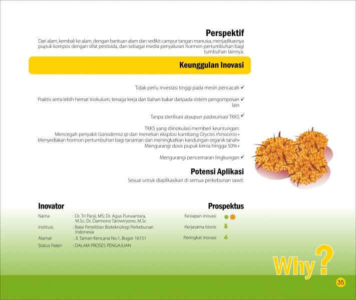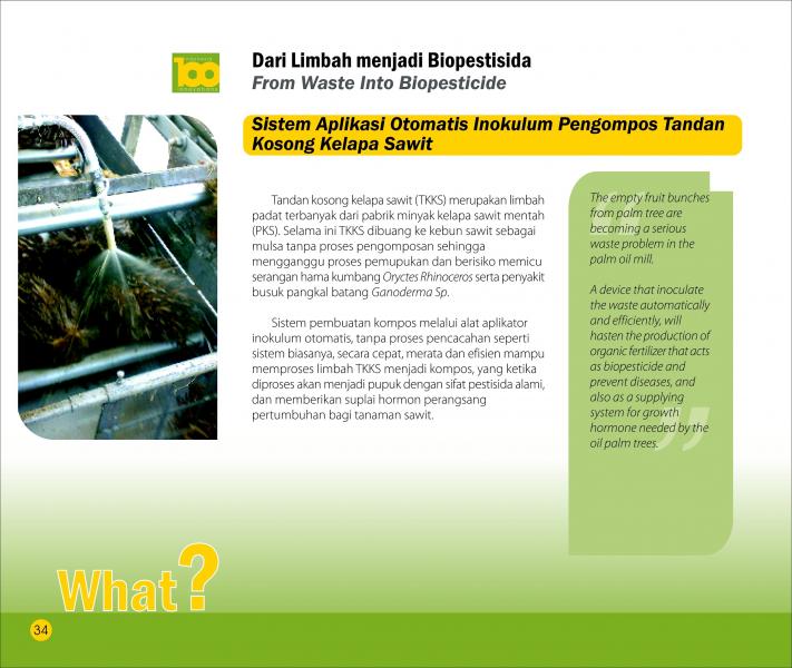 Dari Limbah menjadi BiopestisidaFrom Waste Into BiopesticideSistem Aplikasi Otomatis Inokulum Pengompos Tandan Kosong Kelapa Sawit Status Paten: Dalam Proses Pengajuan Kesiapan Inovasi: ** Siap Dikomersialkan Kerjasama Bisnis: * Terbatas Peringkat Inovasi: * Terbatas | |