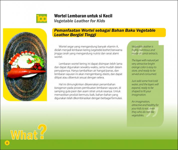 Wortel Lembaran Untuk Si KecilVegetable Leather for KidsPemanfaatan Wortel Sebagai Bahan Baku Vegetable Leather Bergizi Tinggi Status Paten: Telah Terdaftar Kesiapan Inovasi: ** Siap Dikomersialkan Kerjasama Bisnis: *** Terbuka Peringkat Inovasi: *** Terbuka | |