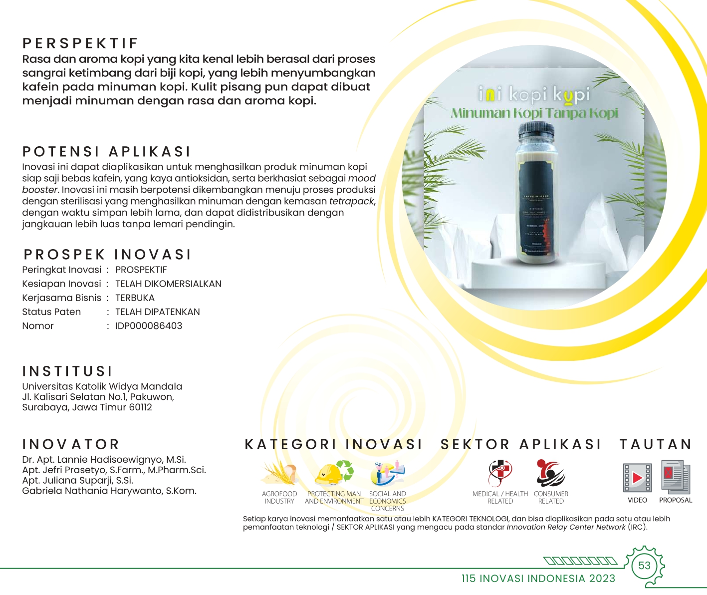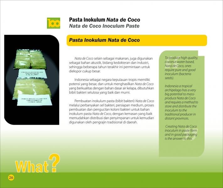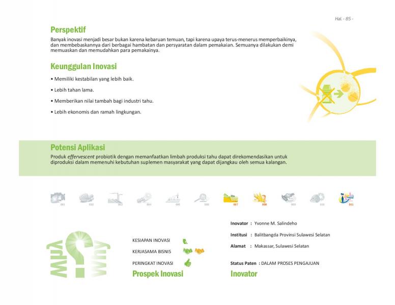 Yoghurt Jus Buah Tropis AsliAuthentic Tropical Fruit Juice YogurtBio-Fruitghurt: A New Generation of Healthy Probiotic Drink derived from Tropical Juices Fermentation by Lactic Acid Bacteria Status Paten: Dalam Proses Pengajuan Kesiapan Inovasi: ** Siap Dikomersialkan Kerjasama Bisnis: ** Luas Peringkat Inovasi: ** Luas |