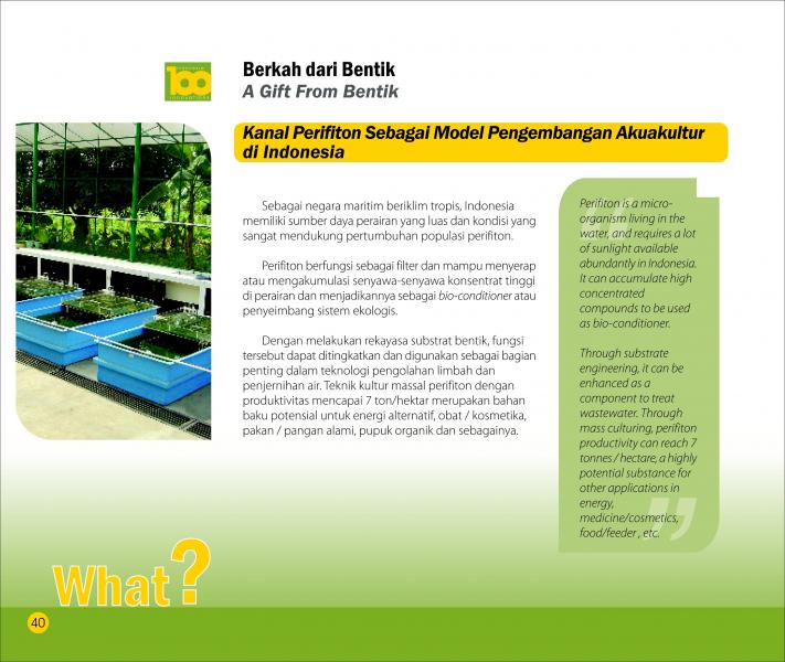 Berkah dari BentikA Gift From BentikKanal Perifiton Sebagai Model Pengembangan Akuakultur di Indonesia Status Paten: Dalam Proses Pengajuan Kesiapan Inovasi: * Prototype Kerjasama Bisnis: * Terbatas Peringkat Inovasi: * Terbatas | |