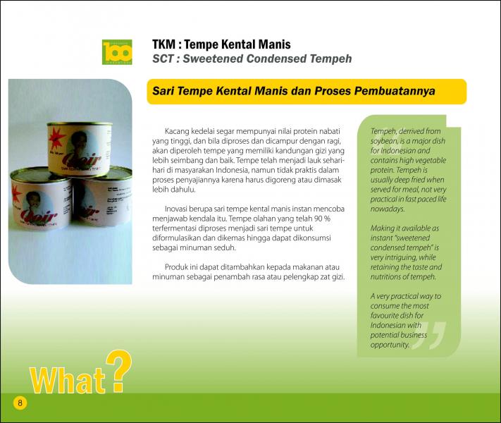 TKM : Tempe Kental ManisSCT: Sweetened Condensed TempehSari Tempe Kental Manis dan Proses Pembuatannya Status Paten: Telah Terdaftar Kesiapan Inovasi: ** Siap Dikomersialkan Kerjasama Bisnis: ** Luas Peringkat Inovasi: ** Luas | |