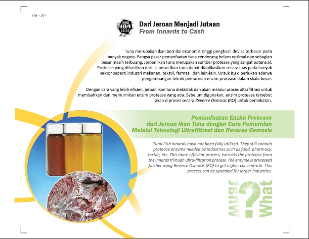 Dari Jeroan Menjadi JutaanFrom Innards to CashPemanfaatan Enzim Protease dari Jeroan Ikan Tuna dengan Cara Pemurnian Melalui Teknologi Ultrafiltrasi dan Reverse Osmosis Status Paten: Dalam Proses Pengajuan Kesiapan Inovasi: * Prototype Kerjasama Bisnis: * Terbatas Peringkat Inovasi: * Terbatas | |