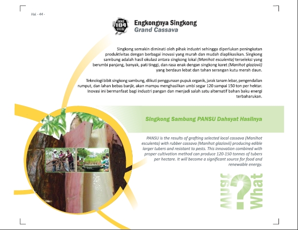 Singkong yang Bukan Sembarang SingkongNot Just Any CassavaREVITA, CARVITA, MERINA VITA , TIGA SERANGKAI VARIAN BARU UBI KAYU HASIL REKAYASA IN VITRO Status Paten: Telah Terdaftar Kesiapan Inovasi: ** Siap Dikomersialkan Kerjasama Bisnis: * Terbatas Peringkat Inovasi: * Terbatas | |