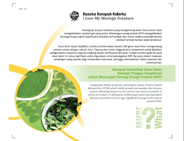 Tetap Sehat saat DaruratStay Healthy in EmergencyNutriBiskuit Moringa Clarias sebagai Pangan Darurat Status Paten: Dalam Proses Pengajuan Kesiapan Inovasi: Kerjasama Bisnis: * Terbatas Peringkat Inovasi: * Terbatas | |