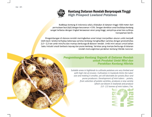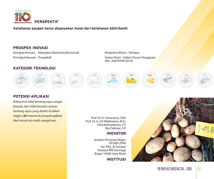 Banyak Anak Banyak RejekiThe More the MerrierZat Pengatur Tumbuh untuk Meningkatkan Produksi Umbi Mini Kentang Status Paten: Telah Terdaftar Kesiapan Inovasi: *** Telah Dikomersialkan Kerjasama Bisnis: *** Terbuka Peringkat Inovasi: *** Terbuka | |
