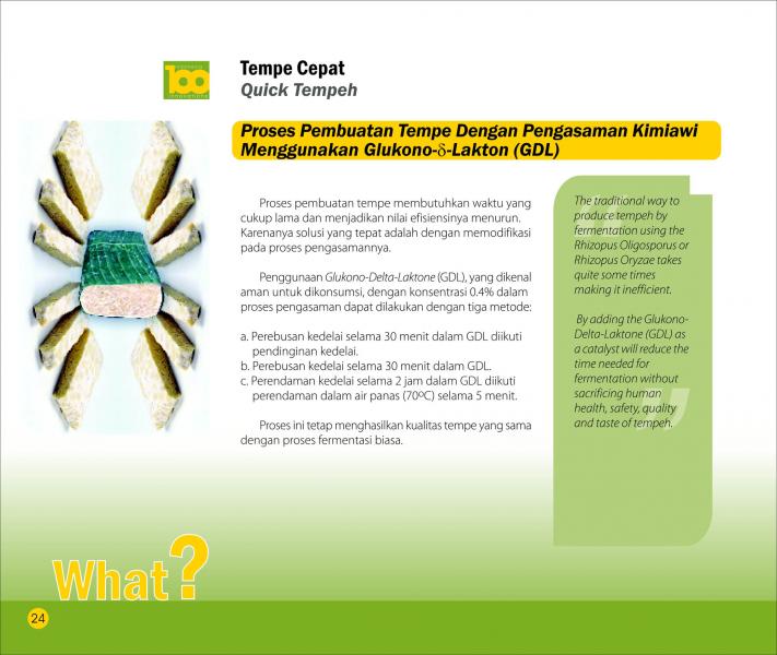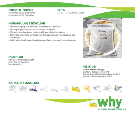 Tempe CepatQuick TempehProses Pembuatan Tempe Dengan Pengasaman Kimiawi Menggunakan Glukono-Delta-Laktone (GDL) Status Paten: Telah Terdaftar Kesiapan Inovasi: * Prototype Kerjasama Bisnis: ** Luas Peringkat Inovasi: ** Luas | |