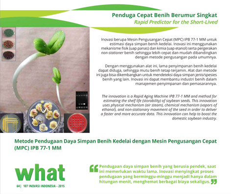 Bibit Unggul Berkat BakteriBacteria for Top SeedsAplikasi Bakteri Probiotik untuk Meningkatan Mutu Benih Jagung dan Cabai Status Paten: Dalam Proses Pengajuan Kesiapan Inovasi: Kerjasama Bisnis: *** Terbuka Peringkat Inovasi: *** Terbuka | |
